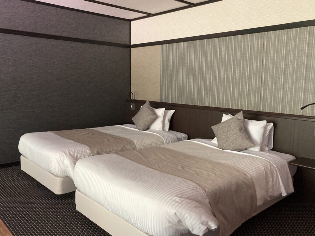 部屋にセミダブルベッドが2台付いていて、食事で部屋を空けた時に、リビングエリアに敷き布団を2組、追加で敷いてくれました。