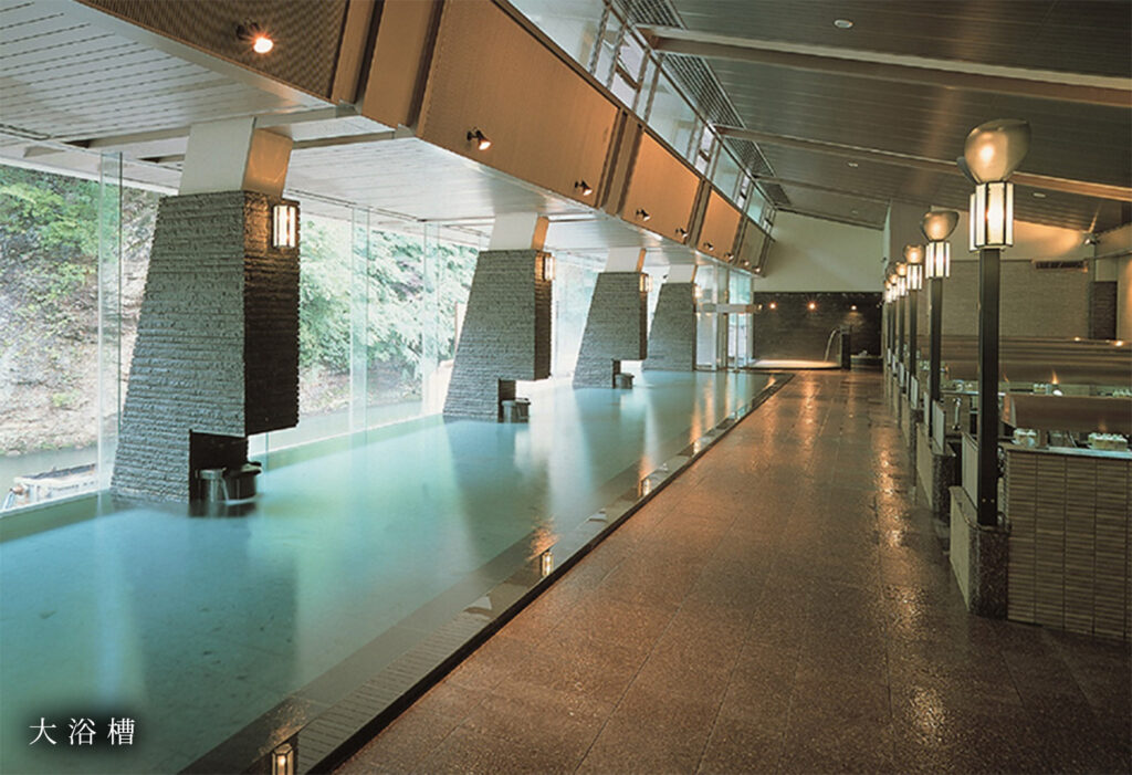 日高見の湯は立体的な配置で沢山の種類の風呂があり、階段を降りた洞窟のような大空間にある檜風呂が特徴。