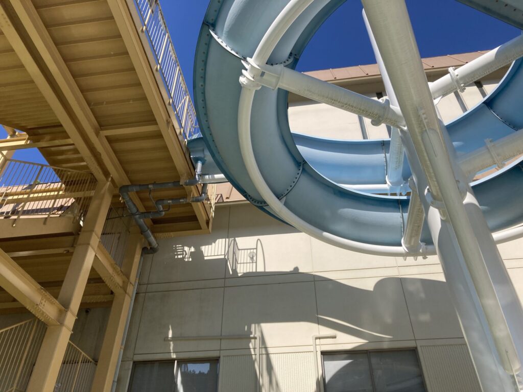 屋内プールと屋外のウォータースライダー