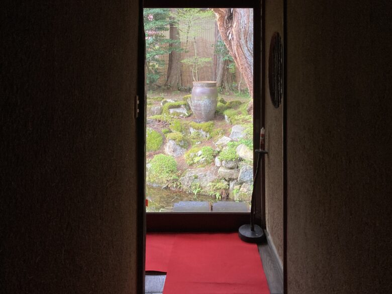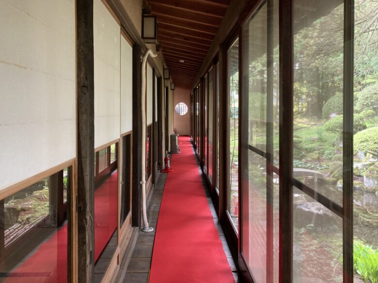 土間で靴を脱ぎ、案内されるまま正面の毛氈が敷かれた廊下を進むと、、