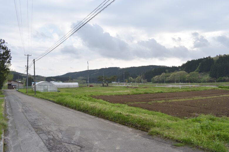 酒田駅から庄内平野を突っ切って16分(9km)ほど進むと山麓に着き、更に4分(2km)ほど山道を進むとすり鉢状の小さな集落が現れます。